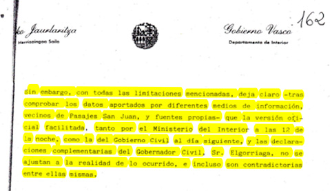 ( 1 ) La versión Oficial facilitada tanto por el Ministerio del Interior, como la del Gobierno Civil y las declaraciones complementarias del Gobernador Civil Sr. Elgorriaga, no se ajustan a la realidad de lo ocurrido e incluso son contradictorias entre si.