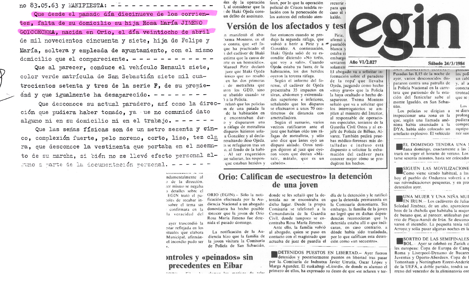 Rosa Jimeno oriotarra da. Egun horretan Donostian zen. Autoa aparkatzen ari zela bi gizonezko hurbildu zitzaizkion, normal jantzita, baina poliziak ziren, eta Polizia Nazionalaren Amarako egoitzara eraman zuten. Atetik sartu eta aurreneko gauza hormaren kontra bota zuten. Hortik aurrera torturak etengabeak, amaigabeak eta basatiak izan ziren: bainera egin zioten, poltsa jarri, elektrodoak, zartakoak telefono listinarekin… jipoitu egiten zuten, gero arnasa bueltatzeko denbora eman eta berriro egurra ematen zioten. Hauts zuri batzuk eman zizkioten urarekin nahastuta, drogak edo. Lau egun pasatu zituen han Rosak, ez zekiela gaua ala eguna zen; halakoxea zen mina, hiltzea ere nahiago zuela.
